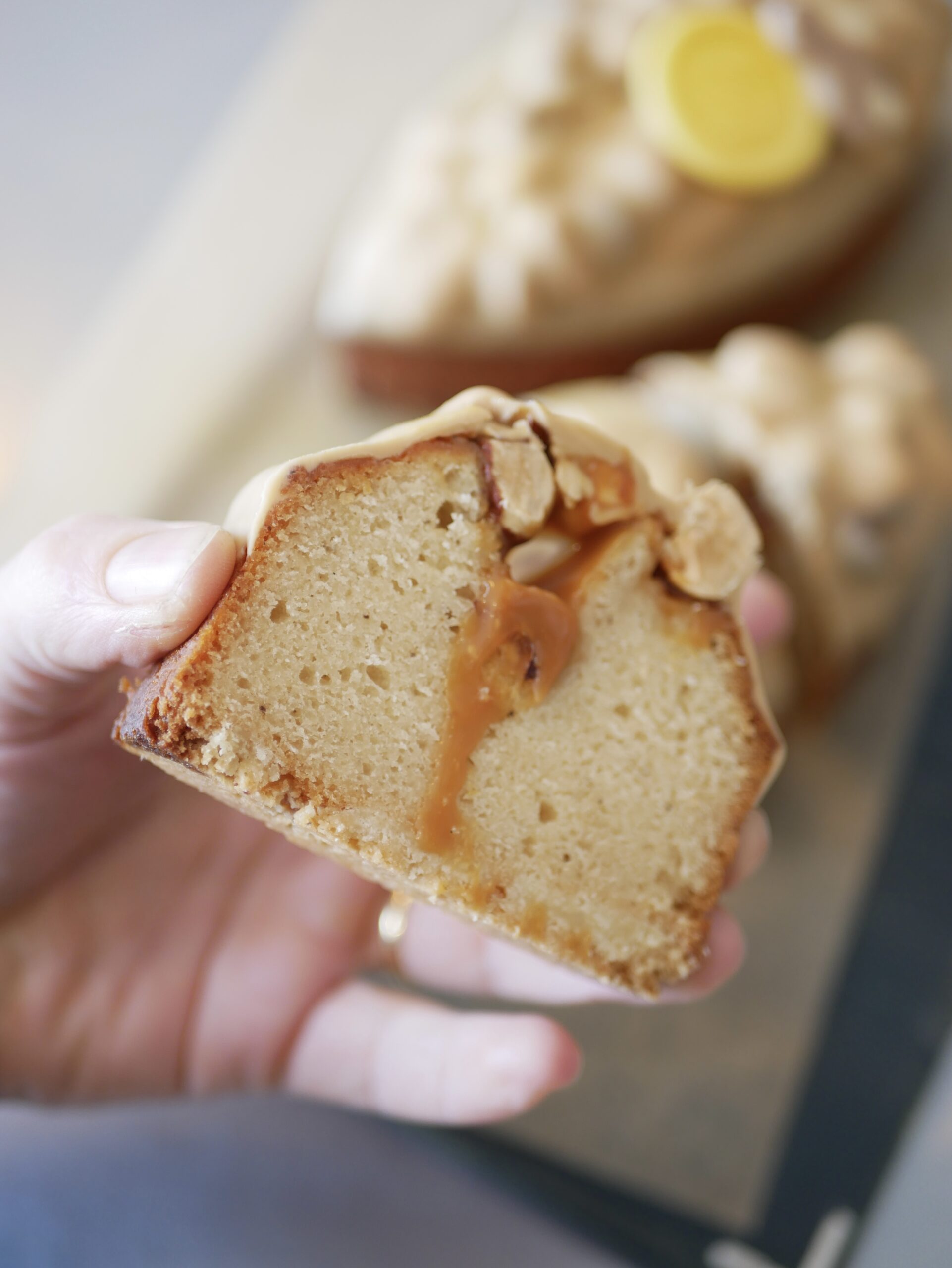 Le cake caramel, c’est un délicieux financier à la vanille posé sur une base de sablé breton et recouvert de caramel tendre et de noisettes et amandes caramélisées, le tout enrobé de chocolat au caramel.