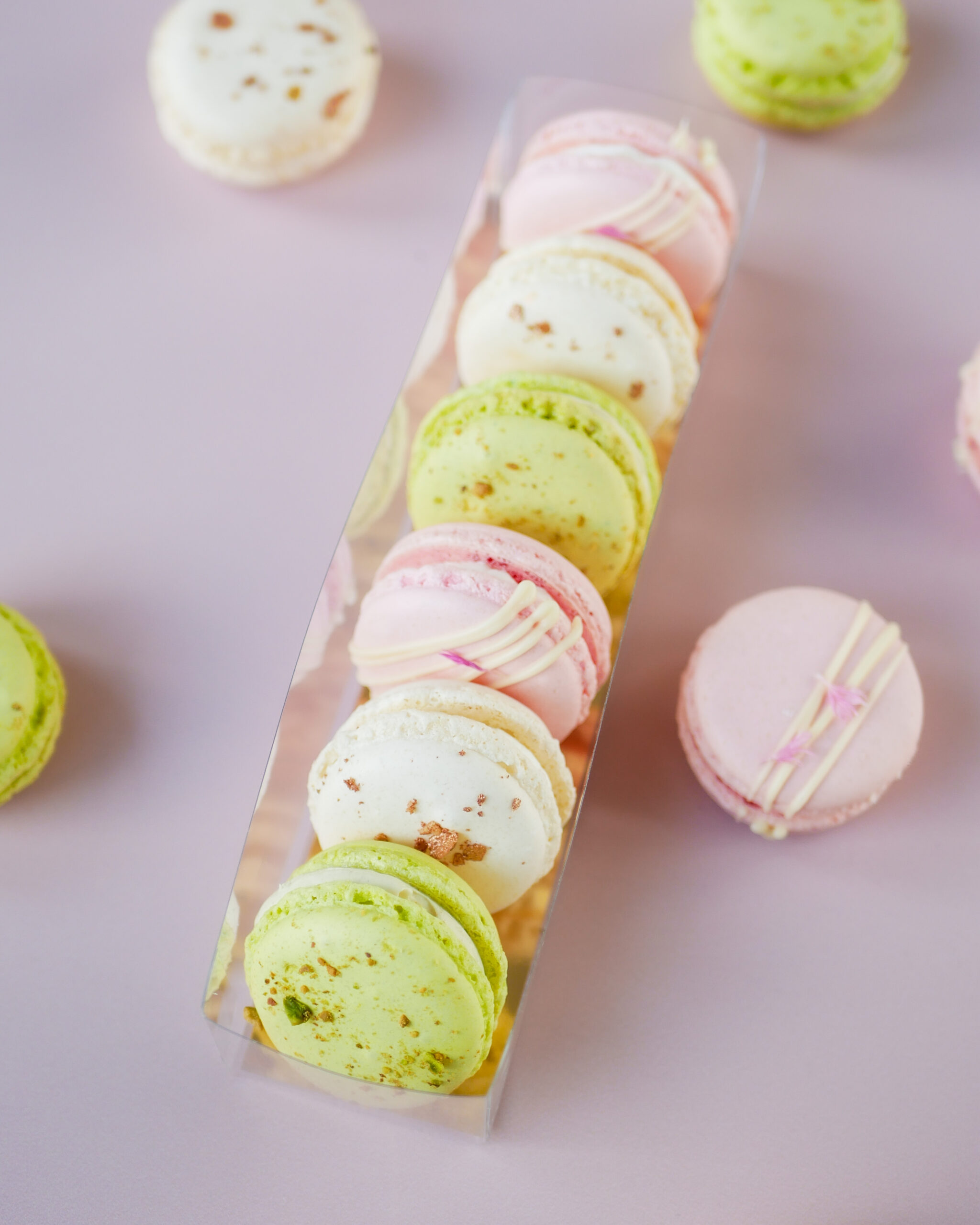 Ils sont emballés dans un joli tube de dégustation de 6 pièces : 2 caramel beurre salé, 2 pistache, 2 vanille.